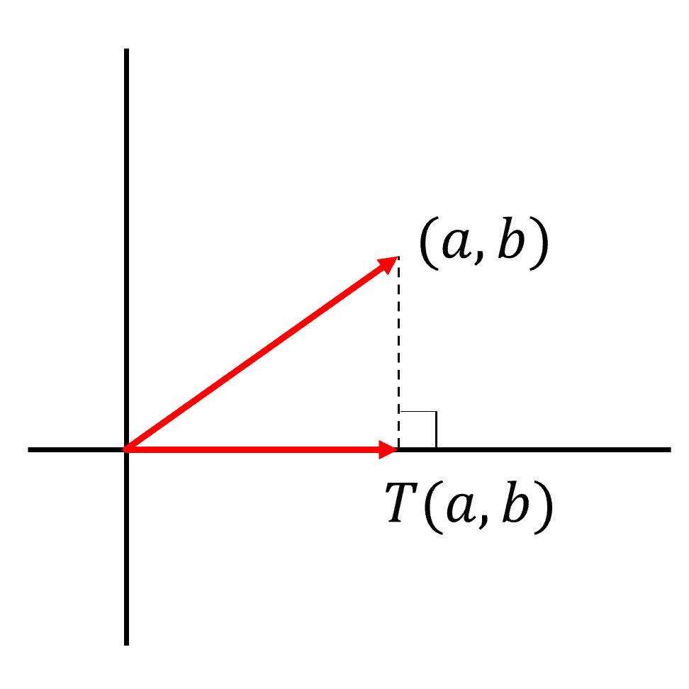 함수 $T:\mathbb{R^2\to R^2},\;(x,y)\mapsto(x,0)$ 을 생각하자. $T$ 는 'x축으로 사영'이라고 한다. 이 함수에 이런 이름이 붙은 이유는 위 그림을 보면 직관적으로 알 수 있다. 다음의 증명에 따라 x축으로 사영은 선형변환이다.