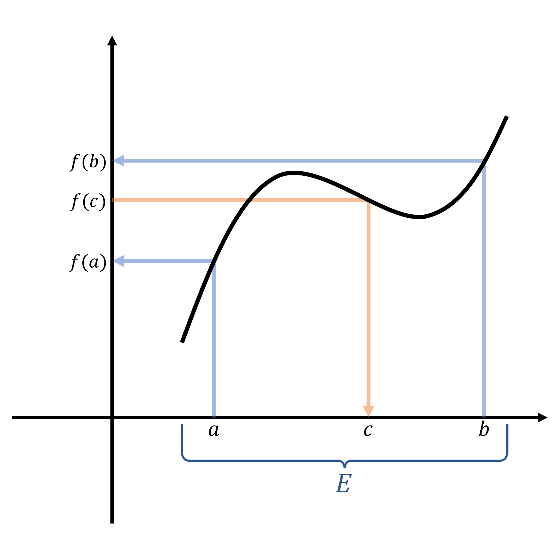 처음에 $a,b\in E$ 를 임의로 선택하였으므로 정의에 따라 $f$ 는 $E$ 에서 사잇값 성질을 갖는다.